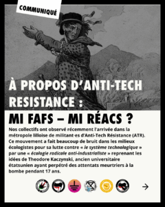 Nos collectifs ont observé récemment l’arrivée dans la métropole lilloise de militant·es d’Anti-Tech Résistance (ATR). Ce mouvement a fait beaucoup de bruit dans les milieux