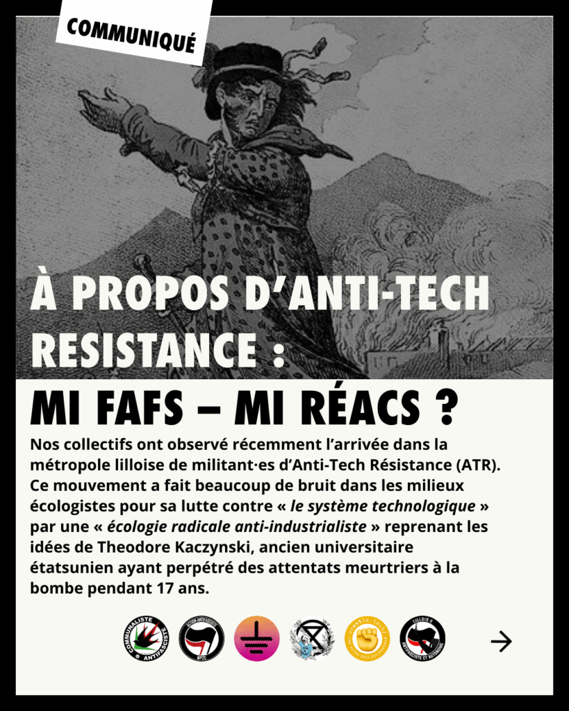 Nos collectifs ont observé récemment l’arrivée dans la métropole lilloise de militant·es d’Anti-Tech Résistance (ATR). Ce mouvement a fait beaucoup de bruit dans les milieux écologistes pour sa lutte contre « le système technologique » par une « écologie radicale anti-industrialiste » reprenant les idées de Theodore Kaczynski (1942–2023), un ancien universitaire étatsunien ayant perpétré des attentats meurtriers à la bombe pendant 17 ans. S’il est pertinent de critiquer un usage de la technologie toujours plus déshumanisant et au service d’intérêts capitalistes extractivistes, il est nécessaire d’alerter sur différents points de la « doctrine ATR ».
