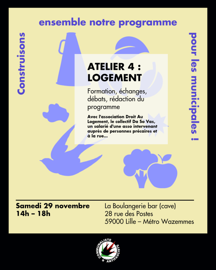 🏙️ On s’attaque au volet logement du programme municipal ce samedi 29 novembre à partir de 14h à la Boulangerie bar (au niveau de la cave, non-accessible PMR) : 🔴 14h-16h : Formation sur les questions liées au logement proposée par l’Offensive avec l’association Droit au Logement, le collectif Da So Vas et un salarié […]