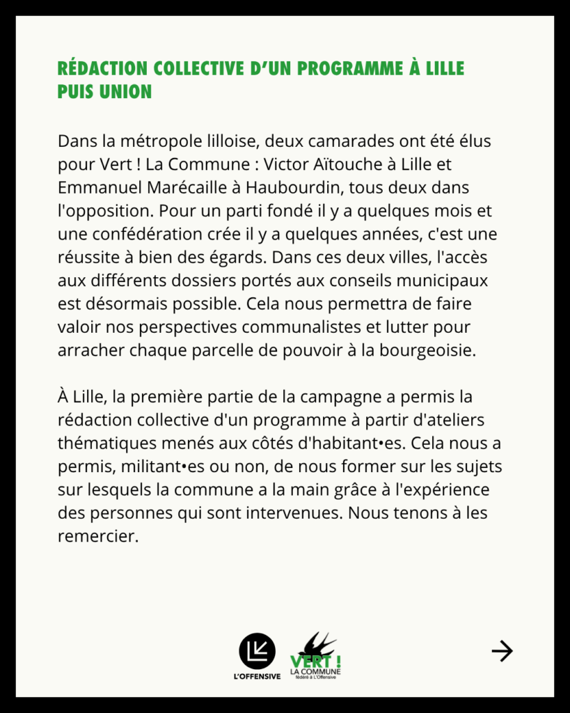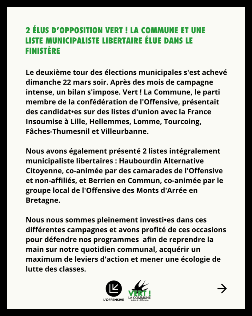 Le deuxième tour des élections municipales s’est achevé dimanche 22 mars au soir. Après des mois de campagne intense, un bilan s’impose. Vert ! La Commune, le parti membre de la confédération de l’Offensive, présentait des candidat•es sur des listes d’union avec la France Insoumise à Lille, Hellemmes, Lomme, Tourcoing, Fâches-Thumesnil et Villeurbanne. Nous avons également présenté 2 listes intégralement municipalistes libertaires : Haubourdin Alternative Citoyenne, co-animée par des camarades de l’Offensive et non-affiliés, et Berrien en Commun, animée par le groupe local de l’Offensive des Monts d’Arrée en Bretagne. Nous nous sommes pleinement investi•es dans ces différentes campagnes et avons profité de ces occasions pour défendre nos programmes afin de reprendre la main sur notre quotidien communal, acquérir un maximum de leviers d’action et mener une écologie de lutte des classes.