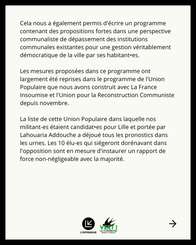 À Lille, la première partie de la campagne a consisté en la rédaction collective d’un programme à partir d’ateliers thématiques menés aux côtés d’habitant•es. Cela nous a permis, militant•es ou non, de nous former sur les sujets sur lesquels la commune a la main grâce à l’expérience des personnes qui sont intervenues. Nous tenons à les remercier. Cela nous a également permis d’écrire un programme qui contient des propositions fortes dans une perspective communaliste de dépassement à terme des institutions communales existantes pour une gestion véritablement démocratique de la ville par et pour nous, ses habitant•es. Les mesures proposées dans ce programme ont largement été reprises dans le programme de l’Union Populaire que nous avons construit avec La France Insoumise et l’Union pour la Reconstruction Communiste depuis novembre.