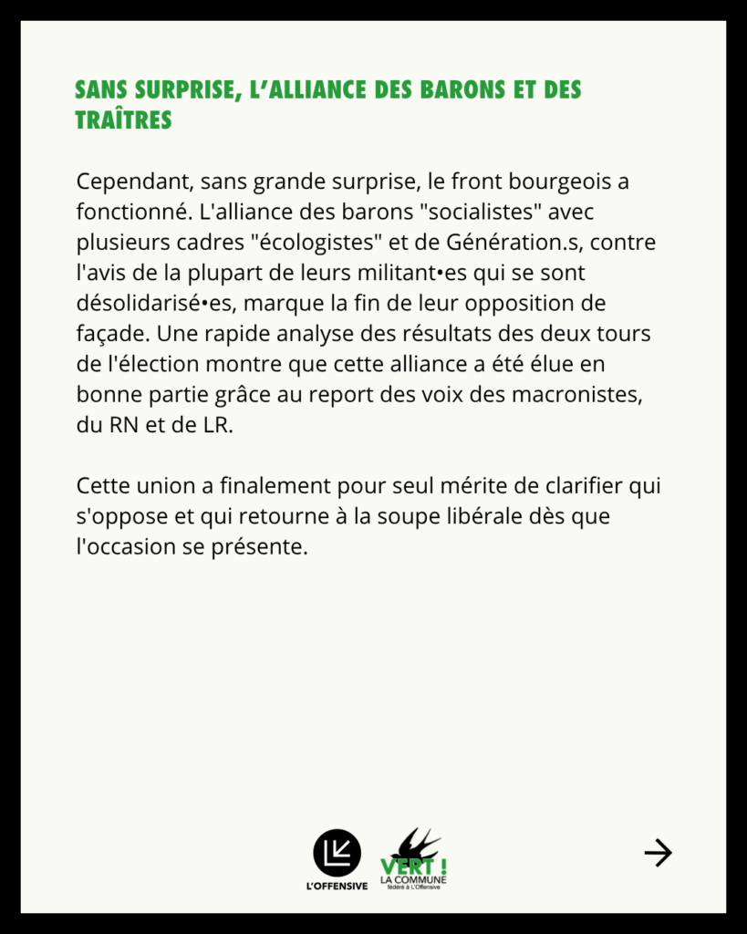 Cependant, sans grande surprise, le front bourgeois a fonctionné. L’alliance des barons « socialistes » avec plusieurs cadres « écologistes » et de Génération.s, contre l’avis de la plupart de leurs militant•es qui se sont désolidarisé•es, marque la fin de leur opposition de façade. Une rapide analyse des résultats des deux tours de l’élection montre que cette alliance a été élue en bonne partie grâce au report des voix des macronistes, du RN et de LR. Cette union a finalement pour seul mérite de clarifier qui s’oppose et qui retourne à la soupe libérale dès que l’occasion se présente.