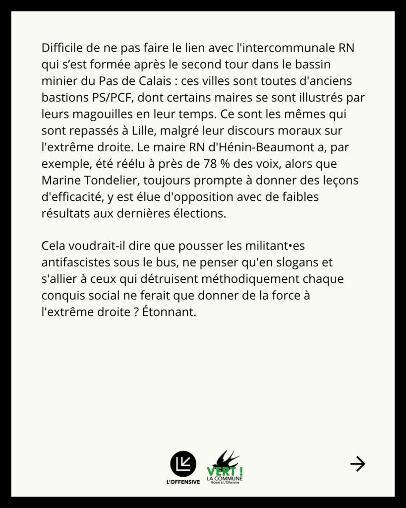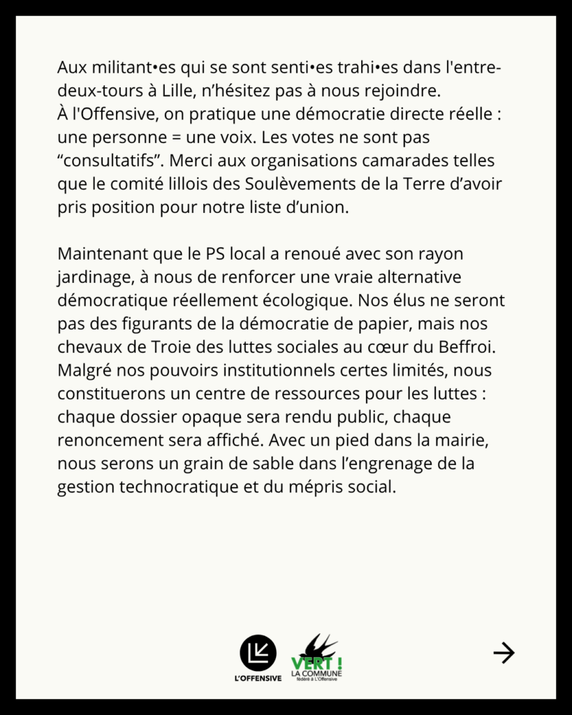 Difficile de ne pas faire le lien avec l’intercommunale RN qui s’est formée ce dimanche de second tour dans le bassin minier du Pas-de-Calais : ces villes sont toutes d’anciens bastions PS/PCF, dont certains maires se sont illustrés par leurs magouilles en leur temps. Ce sont les mêmes qui sont repassés à Lille, malgré leurs discours moraux sur l’extrême droite. Le maire RN d’Hénin-Beaumont a par exemple été réélu à 78%, alors que Marine Tondelier, toujours prompte à donner des leçons d’efficacité, y est élue d’opposition avec de faibles résultats aux dernières élections. Cela voudrait-il dire que pousser les militant•es antifascistes sous le bus, ne penser qu’en slogans et s’allier à ceux qui détruisent méthodiquement chaque acquis social ne ferait que donner de la force à l’extrême droite ? Étonnant. Aux militant•es d’une écologie sincère qui se sont senti•es trahi•es dans l’entre-deux-tours à Lille, nous adressons un appel : rejoignez-nous. À l’Offensive, nous pratiquons une démocratie directe réelle : une personne = une voix – les votes ne sont pas « consultatifs ». Nous saluons les organisations camarades telles que les Soulèvements de la Terre, la Brique ou la Brigade du Respect qui ont fini par appeler à voter pour notre liste d’Union Populaire.