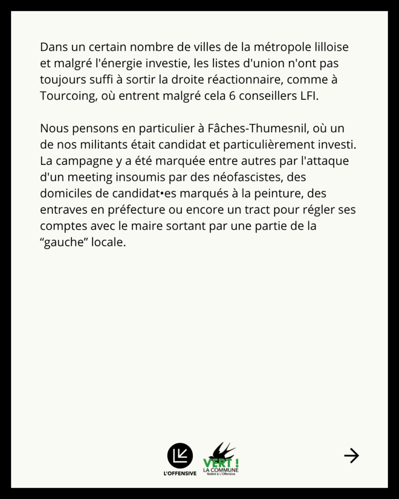 Dans un certain nombre de villes de la métropole lilloise et malgré l’énergie investie, les listes d’union n’ont pas toujours suffi à sortir la droite réactionnaire, comme à Tourcoing où entrent malgré cela 6 conseillers LFI, ou à l’empêcher de prendre la mairie. Nous pensons en particulier à Fâches-Thumesnil, où un de nos militants était candidat et particulièrement investi. La campagne y a été marquée entre autres par l’attaque d’un meeting insoumis par des néofascistes, des domiciles de candidat•es marqués à la peinture, des entraves en préfecture ou encore un tract pour régler ses comptes avec le maire sortant par une partie de la “gauche” locale.