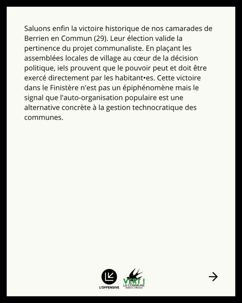Saluons enfin la victoire historique de nos camarades de Berrien en Commun (29). Leur élection valide la pertinence du projet communaliste. En plaçant les assemblées locales de village au cœur de la décision politique, iels prouvent que le pouvoir peut et doit être exercé directement par les habitant•es. Cette victoire dans le Finistère n’est pas un épiphénomène mais le signal que l’auto-organisation populaire est une alternative concrète à la gestion technocratique des communes.