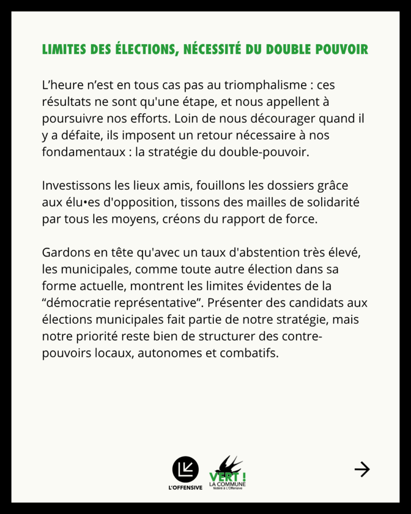 L’heure n’est en tout cas pas au triomphalisme : ces résultats ne sont qu’une étape, et nous appellent à poursuivre nos efforts. Loin de nous décourager, ils imposent un retour nécessaire à nos fondamentaux : la stratégie du double-pouvoir. Investissons les lieux amis, fouillons les dossiers grâce aux élu•es d’opposition, tissons des mailles de solidarité par tous les moyens, créons du rapport de force. Gardons en tête qu’avec un taux d’abstention très élevé, les municipales, comme toute autre élection dans sa forme actuelle, montrent les limites évidentes de la “démocratie représentative”.
