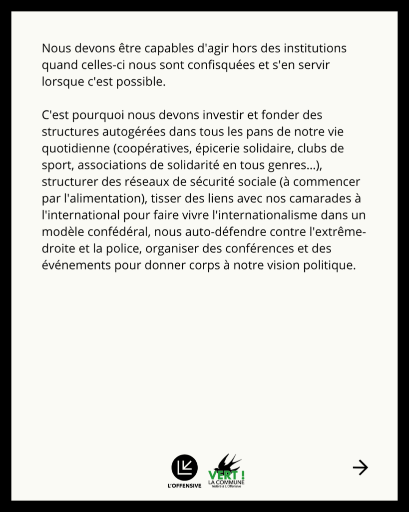 Présenter des candidats aux élections municipales fait partie de notre stratégie, mais notre priorité reste bien de structurer des contre-pouvoirs locaux, autonomes et combatifs. Nous devons être capables d’agir hors des institutions quand celles-ci nous sont confisquées et s’en servir lorsque c’est possible. C’est pourquoi nous devons investir et fonder des structures autogérées dans tous les pans de notre vie quotidienne (coopératives, épicerie solidaire, clubs de sport, associations de solidarité en tous genres…), structurer des réseaux de sécurité sociale (à commencer par l’alimentation), tisser des liens avec nos camarades à l’international pour faire vivre l’internationalisme dans un modèle confédéral, nous autodéfendre contre l’extrême-droite et la police, organiser des conférences et des événements pour donner corps à notre vision politique.
