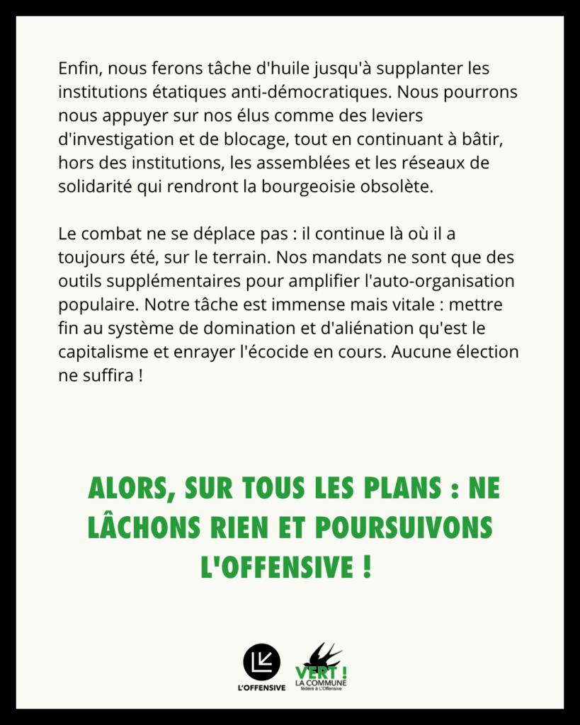 Enfin, nous ferons tâche d’huile jusqu’à supplanter les institutions étatiques anti-démocratiques. Nous pourrons nous appuyer sur nos élus comme des leviers d’investigation et de blocage, tout en continuant à bâtir, hors des institutions, les assemblées et les réseaux de solidarité qui rendront la bourgeoisie obsolète. Le combat ne se déplace pas : il continue là où il a toujours été, sur le terrain. Nos mandats ne sont que des outils supplémentaires pour amplifier l’auto-organisation populaire.